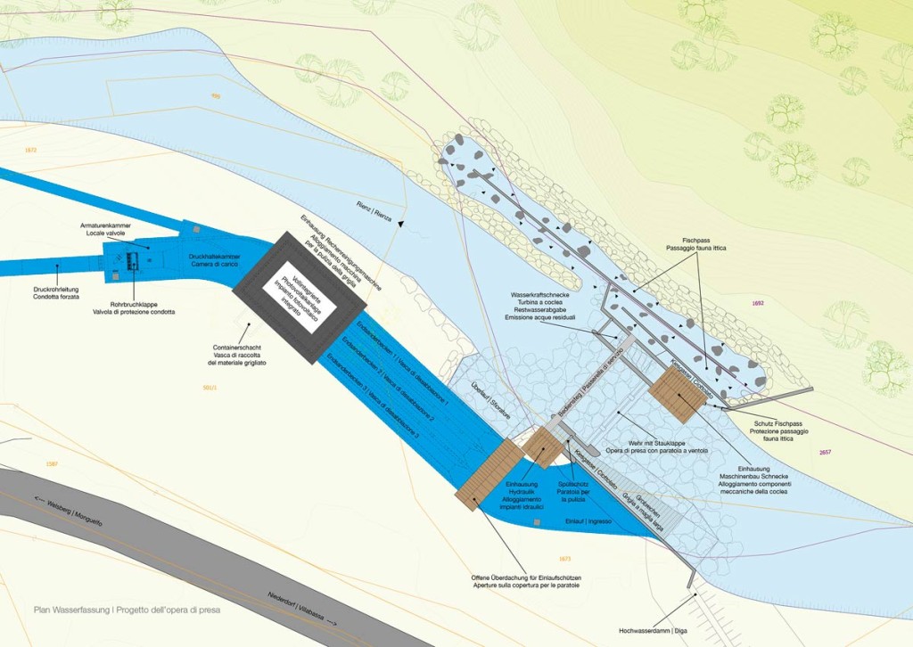 L’opera di presa è progettata per un flusso massimo di 6.000 l d’acqua al secondo, mentre una scala garantisce il passaggio dei pesci. Alcuni sensori misurano e regolano automaticamente la quantità di acqua residua.